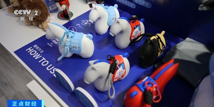 浙江义乌某体育用品门店负责人骆添乐:我们拥有8个顶级国家队以及8个超级豪门俱乐部的全品类授权,例如冰箱贴、胸章、袖扣、徽章这些周边产品、纪念品,还有毛绒玩具,我们都有在开发。