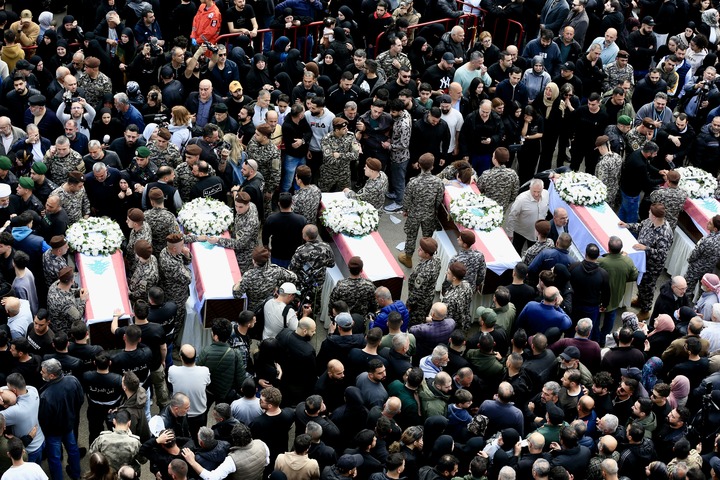 4月11日,在黎巴嫩西顿市,人们参加遭以军空袭丧生的13名安全人员的葬礼。新华社发(阿里·哈希绍 摄)
