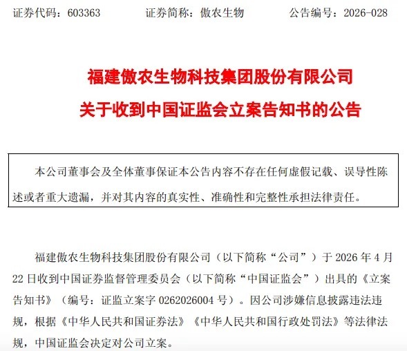 r同日,傲农生物公告称,公司于2026年4月22日收到中国证监会出具的《立案告知书》。因公司涉嫌信息披露违法违规,证监会决定对公司立案。